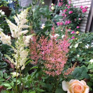 GWにうちの庭に仲間入りしたアスチルベ(redとwhite)と白いスカビオサ、 一回り大きい植木鉢に植え替えて、鉢を並べてみました🥰 最近、アレンジメントに使えるような苗を選んでいます。 手前のバラは揷し木で咲いてくれた「りくほたる」のチビ苗です💕