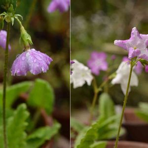 雨でうつむいていた桜草(左) 雨が上がって上を向いてくれました(右)
