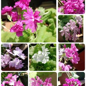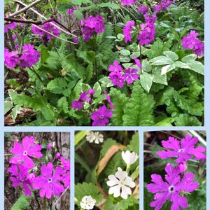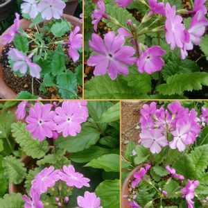 山野草「日本サクラソウ」 雨上がりで元気に4鉢咲きました。 友人から冬に頂き植え替え沢山花が咲きました🌸🌼🌸 裏表がピンク色と裏が濃いピンクで表が薄いピンク色の二種です。