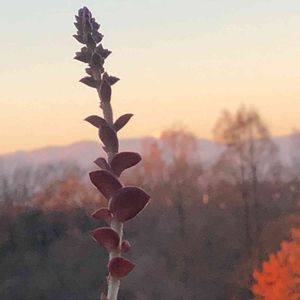 初日の出とは反対方向ながら、日の出を反射する富士山の頂上を背景に、ヒマツリの花茎を。 こんな寒い時期に花茎を伸ばして、花は咲かないまま。開花はいつ頃だろうか?