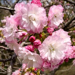 八重桜 桜リレーのアンカーになる品種かな。 大きなぼんぼり、花手毬が、空に広がっている。 🏷❤️桜リレー♫ 🏷桜(さくら)リレー に、参加します。 蕾時の紅色。 咲き進むと、白く変わる。 雌しべの葉シベ化。 から、八重桜・松月とします。