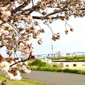 【桜 図鑑】 2020年4月15日撮影 「松月」 荒川左岸 スカイツリーと江北インター