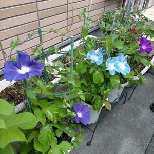 7月7日と遅れて蒔いた朝顔もそろそろお疲れ気味になってきました。種まきから85日目/2ヶ月と23日目。 【1枚目】今朝は久しぶりに水月が綺麗に咲いてくれました。爽やかなスカイブルーに惚れ惚れ😍💕 この素敵ブルーは涼しくなっても早朝のみの特権のようで、今日の撮影は5:40くらいです。真夏よりはマシですが、日が差してくるとどんどん色褪せて冴えない藤色のようになってしまいます。この色を見るためならがんばって早起きするわ〜🥰 【2枚目】他の朝顔も今日は全種類咲いてくれました。 今年は初めての大輪系朝顔でしたが、迫力満点で楽しめました😁 窮屈ならせん支柱のため、蕾が葉っぱにつっかえてなかなかまん丸に咲き切れませんが、それでも中輪種では味わえない魅力を感じました。また来年も育てたいなー😚 【3枚目】日本朝顔はこの通りお疲れのご様子です。もう終わりかなー😢 今回は7月7日と遅い種まきで8月24日に初開花、そこから約1ヶ月でしたが、これは5月に蒔いた方が長持ちするのかしら?🤔 短日で咲くから開花時期はあまり変わらないように思いますが、実際どうなんでしょうね? 来年は5月、6月、7月とずらして蒔いてみようかな。曜白朝顔は短日の影響をあまり受けないらしいので、そういう品種の方がずらし蒔きは楽しめそうな予感。 来年も日本朝顔を育てたいけど、曜白朝顔もいいよねー、迷うわ〜🤭 【4枚目】こちらは西洋朝顔だと思っていたけど違うかもな朝顔です。やはり曜白朝顔なのかな? こちらは鉢が大きめなのでまだまだ元気ハツラツ!👍 下の方の脇芽からの開花が始まったのは嬉しいけど、葉っぱに隠れて見えないのが残念。 同じ鉢に植わっていた西洋朝顔スノーフレークの自家採種は、ちょびっと咲いたきり音沙汰なしです。葉やツルの成長も鈍かったので、F1からの採種で2代目だからかなと推測しています🧐 さて、今後の採種ですが、どうも種が出来ていないんですよね?🤔 以前育てた曜白朝顔などはすぐに種になっちゃって、逆に花がら摘みに大忙しでしたが、今回は放置しても種になりません。受粉出来ていないのかな? まぁ採種できなければまた種を購入すればいいですしね。来年もぜひ水月を蒔きたいわ😆👍 【5枚目】朝顔と同じく7月7日に種まきした矮性カンナは、とうとう蕾がふくらんできました!😆 種まきから85日目/2ヶ月と23日目。 ピンク色が咲くはずで、今か今かと待っています😚