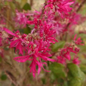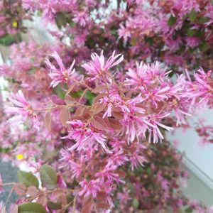🌳木の花たち その210 トキワマンサク(常盤万作) 細い花びらや赤みのある葉が 陽射しを浴びて輝いていました (๑˘⌣˘๑) * 。.:**:¨°*・..。.:*☆ 📍 春光に 常盤万作 煌めいて 🌤 *・゜゚・*:.。..。.:*・'🌳🚲'・✨* :.。. .。.:*・゜゚・* ⌘ メモ ⌘ 🔸科名・属名 マンサク科 トキワマンサク属 🔸学名 Loropetalum chinense var. rubrum 🔸英名 Chinese fringe bush 🔸別名 花色が紅紫色 アカバナマンサク ベニバナトキワマンサク 🔸由来 常緑のマンサクという意味 (マンサクはマンサク科マンサク属で別属) 🔸原産地 日本(静岡県、三重県、熊本県) 台湾 中国南部 ヒマラヤ東部 🔸花期 4月~5月上旬 🔸花色 白 紅紫色 🔸結実 9月〜10月 🔸特徴 常緑小〜中高木、広葉樹。樹高3~6m。 マンサク科トキワマンサク属に1種のみ。 紅紫色の花を咲かせるベニバナトキワマンサクは、 トキワマンサクの変種。基本色は白。 全体に星状毛が密生。 葉は互生する単葉で長さ3~5cmの卵形~卵円形 で全縁、質がやや厚め。若葉は紫紅色、成葉は 緑色になるか赤みを帯びたままとある。葉柄は 2~3mm。 枝先に頭状花序をつけ、長さ2cmほどのひも状の 4弁花を3~8個つける。 果実は長さ6~7mmの楕円状球形の蒴果で星状毛 に密におおわれる。中に黒い種子が2個。
