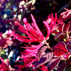 細いリボンのような花 赤い葉っぱも綺麗です 調べて行き着いたのが (アカバナ)トキワマンサク だけど、花期は春とあります❔ あれ〜 違うのかな❔❔❔
