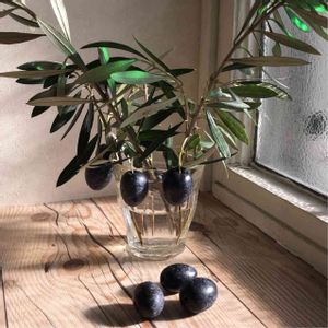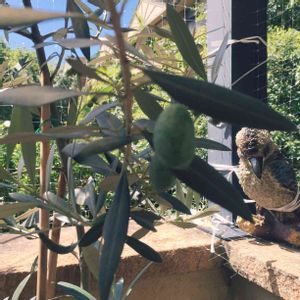 オリーブの実。右後ろにあるのはクカバラ(ワライカワセミ)の置物。