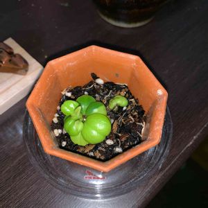 サボテン型🌵の鉢をセールで 見つけました。 早速小さな観葉食物を 300円ショップσ^_^;で 購入し植えてみましたが 名前は何だろう?