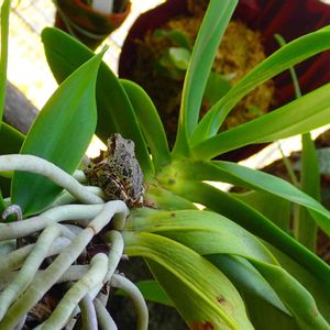 <自道投稿・地道投稿>玄関に置いてます「ナゴラン」(昨年寝室出窓・無加湿ビニール袋)最低温度5度とか、現在玄関9度及第点かな、風蘭も置いてますが、今風呂残り湯に入れてます。少しづつ大きくなってます。