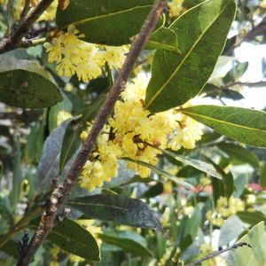 🌱💛月桂樹の花💛🌱 クスノキ科・ゲッケイジュ属 雌雄異株ですが日本で見かける月桂樹(ゲッケイジュ・ローリエ)は雄株が多いようです。 雌雄がありますが、どちらでも花は咲きます。 4月から5月に淡黄色の小さな花がポンポンのようにかたまって咲きます。 果実は、やや艶のある黒紫色で、絞るとオイルを取ることができるそうですが、実は雌株にしかならないので雄株が多い日本では余り見ることはないとのこと。 葉は芳香があり、乾燥させたものはローリエ、ローレルと呼ばれています。煮込み料理によく使われ、臭みを消す効果があると言われています。 月桂樹は、ギリシア神話のアポロンの聖樹とされています。また、古代ギリシアでは、勝利と栄光のシンボルとして、月桂樹の葉と枝で編んだ月桂冠を勝者に与えていました。そのことから、オリンピックやF1レースの勝者を讃える冠に使われることでもおなじみです。