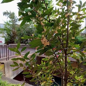 2022/05/08 レストランの建物に入ろうとして駐車場への通路を見たら・・・ あれ? 目が不調なので近くまで行くと・・・月桂樹らしい。 花が終わるところみたい。 レストランの広いホールに並んだ鉢植えにも月桂樹いました。 ん,,段々まばたきしても痛いから明日は朝から眼科た。連休明けの激混み間違いなしですね(((;ꏿ_ꏿ;))) オヤスミナサイ🌃🦉