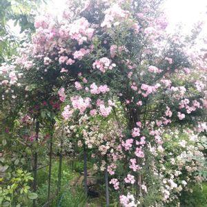 アーチに咲くポンポネッラ 上にはスモークツリー 賑やかです