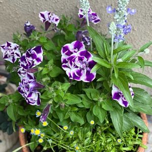 息子たちの玄関前、ビオラからサフィニアに替えてあげました。 零れ種からのサフィニア 98円のサフィニアも楽しめます。