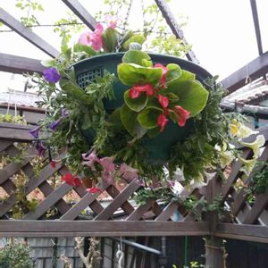 いま、3人で作り上げたばかりのハンギングバスケットです。 ペチュニア8種類9苗、ベコニア3苗、フクシア3種類3苗、リビングストーンデージー2苗、ローダンセマム/レトロクラッカー1苗、計18苗を寄せ植えしました。こんなに沢山の花を寄せ植えしたのは初めてです。