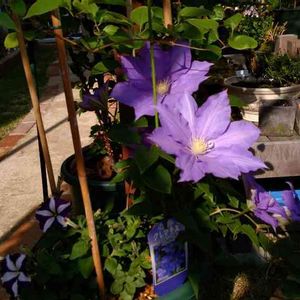駿河のクレマチス/H.F.ヤングが五輪咲きました。本当に写真通りの花です。とても美しい青紫色の花です。強い風にあおられていますが、頑張っ手先誇ってくれています。同じ鉢に植えた赤紫と白のクレマチスも頑張って咲いています。 仕切りをせずに寄せ植えしたので、きっと根が絡まっていることでしょう。