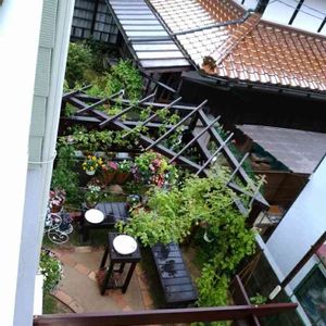 ベランダからの撮影です。つるバラ「ハルカゼ」が風と雨に耐えてくれました。 風雨に弱いペチュニアは避難場所から帰還しました。