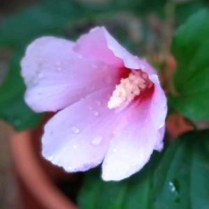 おはようございます。 昨日は沢山雨が降り草花も生き生きしています。 ①ピンク色のムクゲです。 雨に濡れています。 ②ツルニチニチソウの葉です。 班が綺麗な模様になっています。 まだまだとても暑い日が続きますので皆様ご自愛ください。