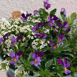 寄せ植えのビオラ・カフェオレ カフェオレっぽくないけど可愛い😆 青いバケツが写ってた…