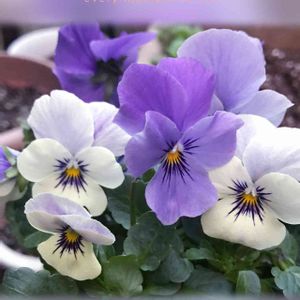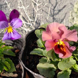 寄せ植え待機中のビオラ🌸 左は頂き物のミックス種育ち 右はマルンマルン どちらも種から育てました。 まだまだおチビな苗ですが、 やっと可愛い花が咲きました♡♡