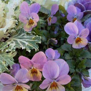葉牡丹の寄植えに便乗したビオラちゃん💜 葉牡丹に埋もれて窮屈そうだけど あなたがいてくれるからステキなの💜🤍💜🤍💜