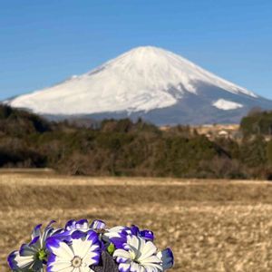 空と富士山🗻がライバル? 白と青さでは、サイネリアも負けないわよ🤍💙 (2022.2.2. 8:02 足柄千保より)