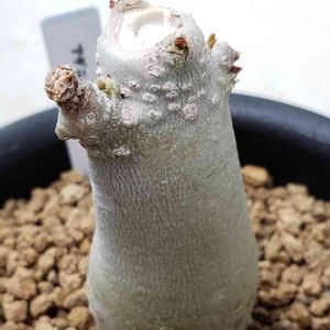 アデニウム・タイソコトラナムの実生苗。双葉が出てからはずっと屋外南側の腰水無しです。根切りをしてから植え付けで、土は赤玉土・鹿沼土・腐葉土の等量配合にマグァンプKをパラパラです。表土だけは赤玉土で飾ってます。順調に育っているからなんかめっちゃ怖いですヾ(≧∇≦)