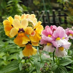 木質化して花付きが悪くなったピンク色の金魚草をバッサリと✂️切り戻したら、なんと黄色とピンクの二色咲きになりました 😁 得した気分 🙌 奥は元のピンク色です