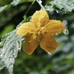 「ヤマブキ(山吹)」✨🌼 戻り梅雨の時期に見つけた キラキラして涼しそうな花です🌧✨🌼✨💕 木陰で二輪だけ咲いていました🎶 暑い日が続くので熱中症に注意ですね🥵😉 バラ科 ヤマブキ属 花言葉 :「気品」「崇高」 ✳︎ 2022年7月13日撮影
