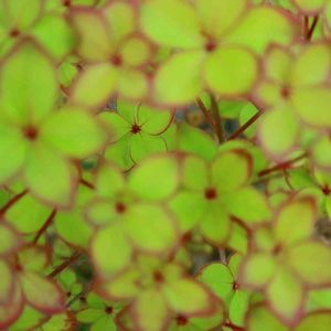 五葉躑躅(ゴヨウツツジ)/白八汐(シロヤシオ) ツツジ科ツツジ属の落葉低木。深山の稜線などに生える。枝を分けながら高さ3mほどに育つと、小枝の先に5枚ずつ葉を広げる。葉は菱形状の卵形で、へりが紅色を帯びていて、毛が密生している。花期は5~6月。枝先に白い花を斜め下向きに咲かせる。花は直径3〜4㎝の漏斗形で、真ん中辺りまで5裂する。雄しべ10本、雌しべ1本。花の中心近くに緑色の斑点がある。果実は蒴果。秋に熟すと裂開する。花の美しさ、紅葉の美しさから園芸用に栽培もされているが、一般的なツツジのように挿し木ができず、種子から育てなければならない。そのため大きく育てるには長い時間がかかる。木の寿命は長く、高さ8mの大木に育つこともある。那須高原の群生が有名で3万本が咲き誇る。愛子内親王のお印の樹木。 枝先に葉が5枚、つまり『五葉』ずつ輪生することが名前の由来。5〜6月、高山の爽やかな風のような清楚な純白の花を咲かせる。その花の色から白八汐の別名がある。花が落ち、秋がやってくると5枚の葉が赤く染まり、まるで花が咲いたようになる。老樹の樹皮が松のようであることから松肌(マツハダ)という別名もある。 出典『樹木の事典 600種』『里山の花木 ハンドブック』『樹木の名前』