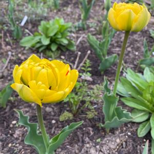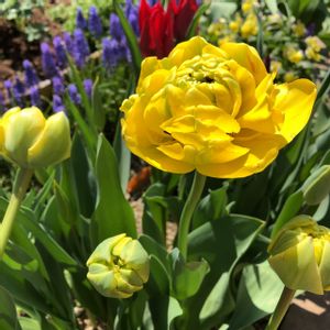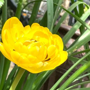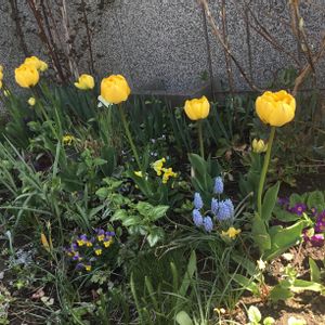 チューリップ・イエローポンポネット 一昨日咲かせて去年は葉っぱしか出てこなかったから引っこ抜いたやつをダメ元で植えたらこんなに咲くとは! チューリップはどうしても分球しちゃうので葉っぱ枯れてから掘り起こして子球を取り除いてまた植えて。 翌年は葉っぱを育ててからまた子球を取り除いて植えたらこんな風に咲く、ってことが実験によりわかりました🤣