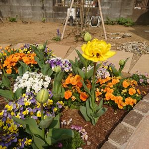 1番咲きそろった時。 今年のチューリップはこちらの場所には八重ばかりをチョイスしました。 日持ちもいいし好きなのですが、意外とユリ咲きのヨハンクライフも長かったです。