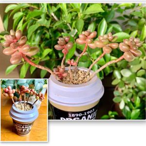 🍂ジェットバース(クラバツム?) セダム属 小型のむちむちの葉が、ロゼット状に丸く並ぶ。 群生する木立性。 春から夏は、緑色。秋からアンティークぼい色に、紅葉時には葉先がピンクらしい これも、もりもりに育てて丼にしようかな😁🎶 葉挿し用に、葉っぱ取りたくなる💦