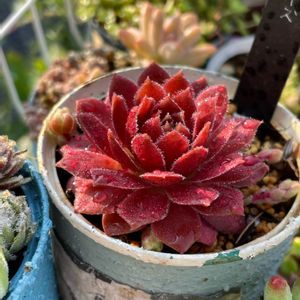 レッドローズ😁センペルヴィウム❗️ もはや他の花の名前ローズってつけられてるしね😂🌹のように赤くて素敵なセンペルちゃんをお迎えしました〜💕 お昼休み事務所から出て蒸し暑さを感じた‼️多肉が心配です。 雨マークはなかったから 野ざらしの多肉をそのままにしてきちゃって、会社に来てから朝がた、霧雨😳しっとりするよね〜☂️かよ!!! そしてこの暑さ☁️やばーい。。。 緑のセンペルと寄せたら可愛いだろうな💕