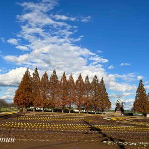 番外編-② 「あけぼの山公園」冬 メタセコイアの色が場所によって違って見える。 パンジーが植えられた土と同じ葉っぱの色のメタセコイア。 2022.11.2撮影