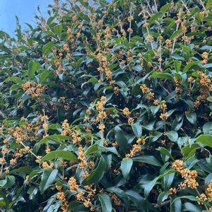 「キンモクセイ(金木犀)」 いい香りがして、見上げると金木犀。 まだ蕾だが香りが強い✨🧡🌳 北海道、本州、四国、九州に分布。