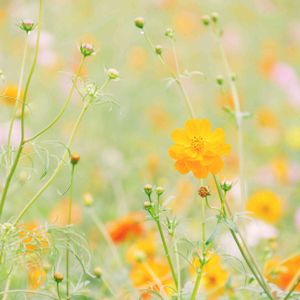 「キバナコスモス(黄花コスモス)」 コスモスより草丈が低く、花径4〜6センチと小さめ。初夏から秋までずっと咲くが、ここは後から植えたもの。 こぼれた種から発芽するので日当たりの良い空き地、土手、道路沿いなどに半野生化している。