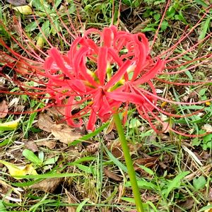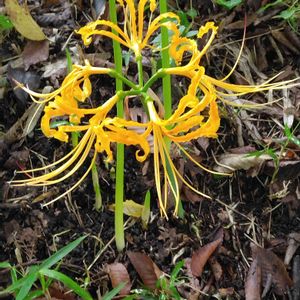 「ショウキズイセン(鍾馗水仙)」 赤い曼珠沙華の花が咲く場所に、ちょっとオレンジがかった黄色の花。曼珠沙華の花はまだ蕾。 四国、九州、沖縄の山野に自生するとあるので、これは栽培種かなっと。