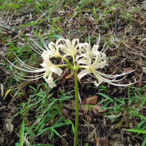 「シロバナマンジュシャゲ(白花曼珠沙華)」 赤い花のマンジュシャゲと黄色のショウキズイセンが自然にかけあわさってできたといわれている。 真っ白ではなく少しクリームがかっている。花びらの先はピンクがかっていて、寿司(すじ)🤣の入った花びらもある。