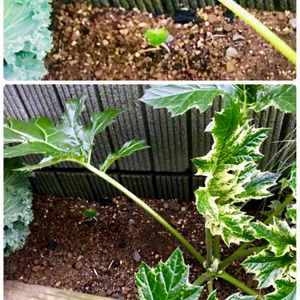 夏のニチニチソウから葉牡丹へ植え替えの際、埋もれていたアカンサスモリスタスマニアエンジェルの子ども発見! このまま横に広がっても良いかも。
