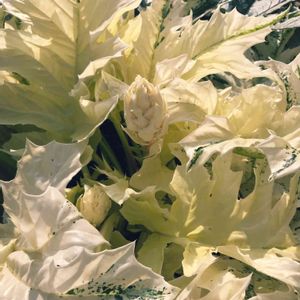 だんだんと葉が開いて、まるでキャベツの中央部分みたいな黄緑、買った時はもっと白かったような…? 少し離れたところに子どもの葉を発見! 花より先に根っこから子どもが。