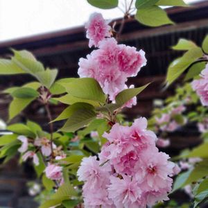 八重桜、満開キラキラ(4月11日撮影) 阿波和三盆糖の製造元 岡田製糖所のお庭の八重桜。(徳島県板野郡上板町) 趣のある古いお屋敷と無造作に置かれた年季の入った道具類もステキでした。