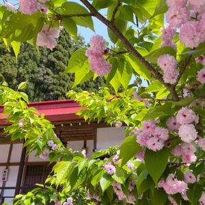 神社⛩の桜が満開でした! 新緑の中の風が気持ちいいです!