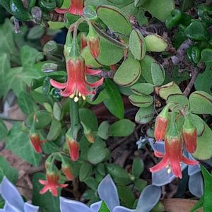 ベンケイソウ科 コチレドン属 『ゴルビュー』 別名∶花簪(花かんざし) 土の中から葉っぱが出てくる面白いコ🤭お花が楽しみです✨ ②毎年お出掛け先で気になる木 ③お出掛け先で青いお花が気になった