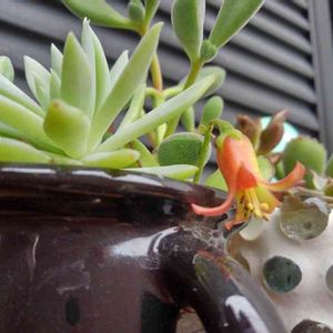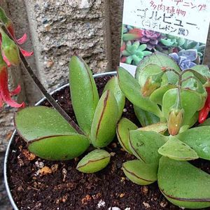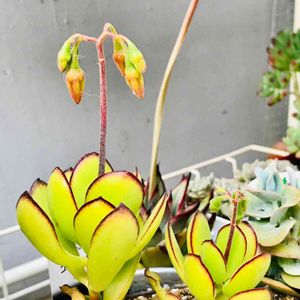 おはようございます✨ 12月に真っ赤っかにしてしまった〜! と投稿した、セダム属の宝珠。 今は緑でテカテカっ✨となりました!良し良し🙂 そしてそして、下にいるゴルビューも可愛いらしい花なんか咲かせちゃったりなんかして 12月のと比較で撮りましたが... こりゃまたゴジャゴジャ見づらい一枚とまりましたとさ。😦