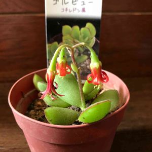 コチレドンのゴルビューという多肉さんが開花してます😄 このお花、上から見てるとタコさんウインナーにしか見えません(笑)