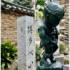 日曜日、博多の櫛田神社⛩にて 神社の小便小僧まで、山笠の水法被に締め込み姿です。 博多べいは、戦国時代焼け落ちた博多の街を早急に復興するために、瓦礫の瓦とか石を塀に埋め込んだ…んだったかな? デザインもオシャレだし、強度も増すだろうし、瓦礫も減るしで一石三鳥ですね。