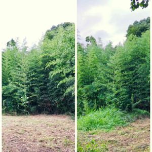 実家裏庭の草刈 左がビフォー、右がアフター かなりの面積で、竹だらけなので難儀しましたが、陽当たりがよくなってスッキリしたので、亡父も喜んでくれたかな?