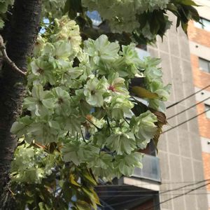 団地敷地内の一角に咲いてます🌸 唯一、1本だけの薄黄緑色 御衣黄桜❓鬱金桜❓ どっちなのでしょうか〜🤭