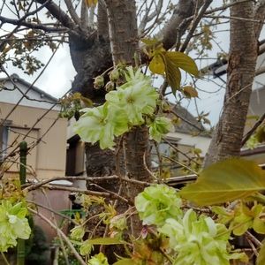 近所の公園、まだ5mほどの若木、これ御衣黄桜だよね? 今まで気付いてなかった(°0°)‼ しかも近くにもう一本。 グリーンの桜はありがたいような、葉っぱのような。