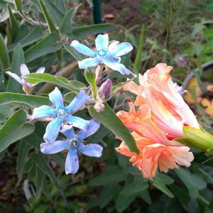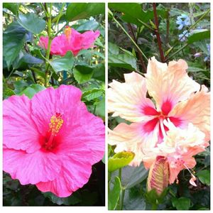 ブルースターとハイビスカス💕今朝は寒かったです😓そろそろハイビスカス鉢上げしようか? このままで来年また、新しい苗を買おうか? 悩む~