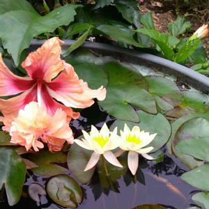 姫スイレンとハイビスカス💕 水の中ではメダカさんがチュッ (#^_^#) 残念❗ちょっとずれてたかな?